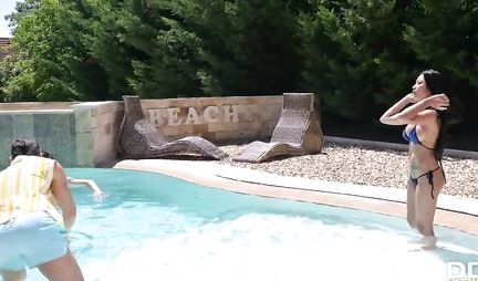 Wealthy men brought an Asian model in a blue bikini to the villa and staged a hard double penetration by the pool. The tattooed skinny girl easily swoops on the tense risers of the bulls and polishes them synchronously with her mouth and anus. You can definitely drain the ocean of a sperm into such a girl.
