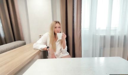 In general, the guy came to visit his girlfriend, but while she was getting ready, he had a nice conversation over a cup of tea with her sister. The blonde turned out to be such a lustful bitch that she decided to seduce her sister's boyfriend while she was not around. The debauchee climbed under the table and insolently began to suck the guy's strong cock. Of course, after such a gorgeous blowjob, he did not give up the pleasure and fucked the beauty. He enjoyed her wet pussy, laid on the table and fucked for pleasure, bringing her to orgasm.