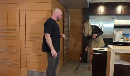 A blonde in a short skirt skillfully sucks a shaft in the kitchen