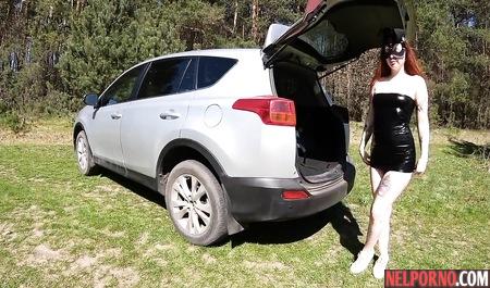 Bearded fat guy wearing sunglasses made girlfriend in mask sucking cock in the nature