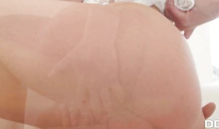 Brunette with big milkings in the pose of cancer enjoys the jolts of the boy