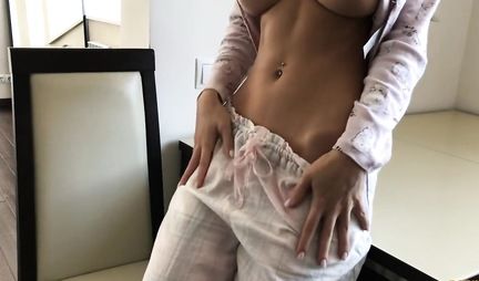 A brunette with elastic tits right at the window pulled down her pajamas pants, after which she began to gently play with her fingers both on the ass and on the pussy. After that, a sex toy is already in the hands of a young girl, which brings the beauty to a bright orgasm. The girl moans, cums from a solo handjob and shoots homemade porn on the chair.