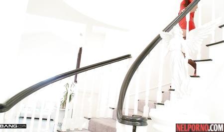 Brunette in stockings cums during spanking with her lover on a white sofa