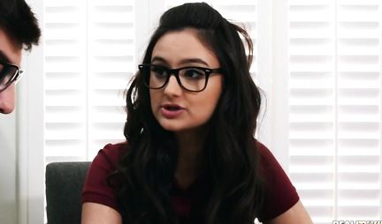 Brunette with glasses at work sticks to a bearded colleague and enjoys a large dick