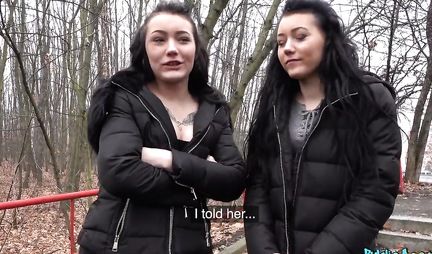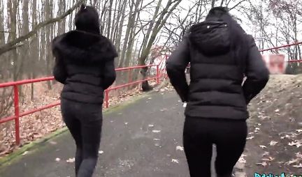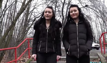 Two brunettes after a pickup make the guy crumple and spread their legs for sex on camera