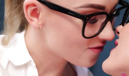 Hot lesbian caresses of two girls with glasses on the couch