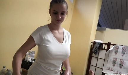 Busty chick gives a cock massage to a regular customer