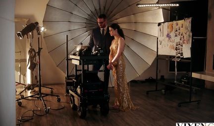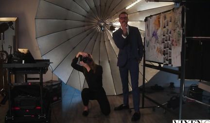 Beautiful brunette gave a blowjob to a colleague after a photo shoot