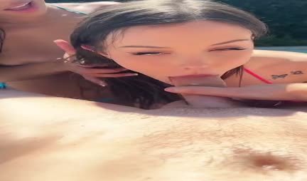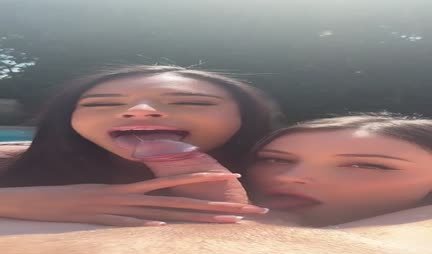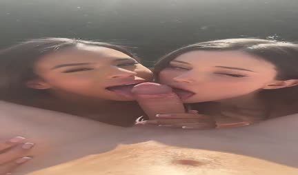 Couple of beauties give a blowjob and jerk off a guy’s strong trunk