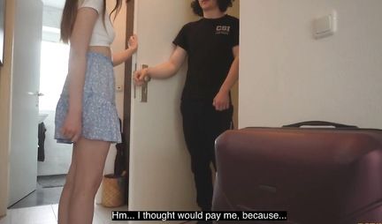 But how, nevertheless, sometimes reality is ordinary and trite sulfur. Here the taxi driver helped the girl and brought a heavy suitcase to the eighth floor, hoping to get a bribe in the amount of at least a couple of hundred. But the girl really lit up the money and offered to suck the dick corny. Well, yes, judging by the dudes manners, he knows how to suck himself, but ... at least a tuft of wool from a black sheep, although later it will also be flogged!