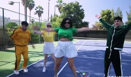 Two busty MILFs are big fans of healthy lifestyle and healthy exercise. In addition, each of the ladies brings up a stepson, and sometimes it strains to the extreme. So today the women decide to spend the day off on the tennis court. Thats just communication is not limited to lout-tennis alone, because the ladies are very excited in the fresh air and actively change stepchildren to get laid! Thats what they call movement!