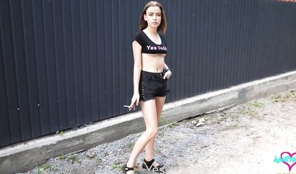 The pickup guy decided to take pictures of a smoking beauty on the street. The girl showed him boobs, and then even agreed to have sex on a video camera. The young woman lay down on the bed, spread her slender legs and framed her shaved crotch for a vaginal. The guy fucked the slut and gave her a powerful orgasm.