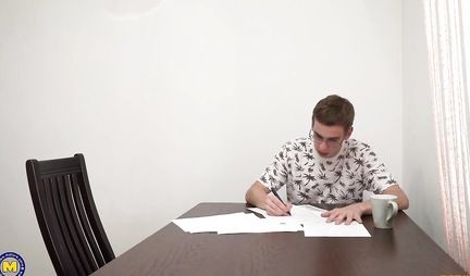 Mature blonde came to the student's home to help him prepare for the exams. But the guy next to the tutor couldn’t think about studying at all, he just did what he was staring at the boobs of this milf. Forgetting about their studies, they retired to the bedroom, where there was a large and comfortable bed. An experienced woman immediately began to give the guy a blowjob to inflame him even more. After the suction, the guy wanted to insert a penis into the cap, but got into anal sex and from the heart fucked an experienced woman in stockings in the ass.