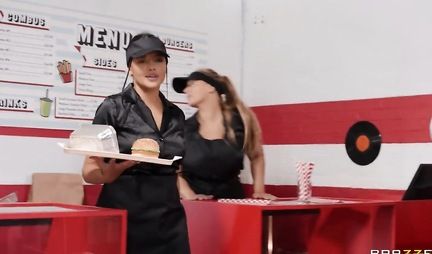 A blonde and a brunette work as waitresses in a cafe. This client himself began to make eyes at them, so the cuties decided to reciprocate. While there was no one in the cafe except them, the girls attacked the guy's big penis and gave him a blowjob. Of course, after such a warm-up, neither the guy nor the lustful waitresses could be stopped. Together they stirred up group sex in the style of ZHMZH and came off to the fullest. Fucking in all poses with a guy, the chicks moaned and finished from real bliss.
