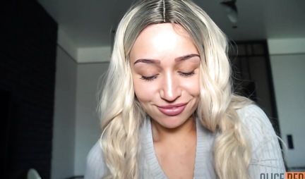 Premium blonde in leggings kneels beautifully and sucks off juicy cock