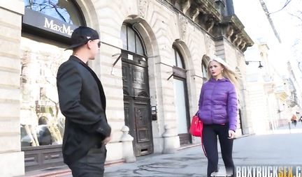 Russian blonde in public is ready to spread her legs for a pickup and get his cock in pussy