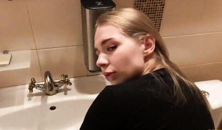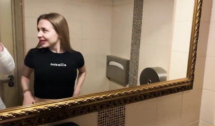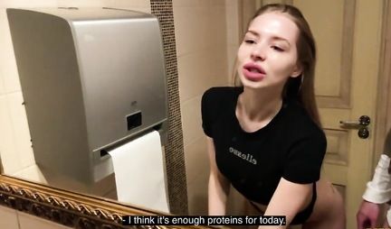 During a workout at the gym, a Russian blonde spotted a cute dude who couldn't take his eyes off her elastic ass. The girl decided to get to know the guy better. Having interrupted the training, they retired to the toilet of the sports club so that no one would interfere with them getting to know each other better. The fair-haired girl in leggings skillfully aroused the guy's cock with oral caresses, and then let him into her pussy, which was already wet with excitement, and fucked a new friend in the toilet.