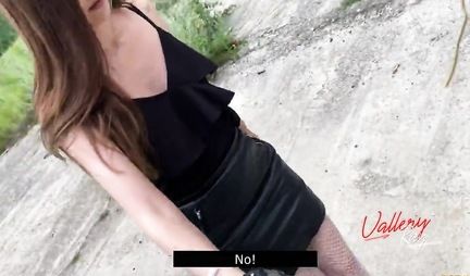 A Russian couple of libertines decided to diversify their sex life. For this, we went to an abandoned shooting. The girl in a short skirt and jacket was not against such an experiment. She is already standing in front of the guy in a pose of cancer and lifting her skirt pulled down her white panties. Her tight pussy is open to love. The little pig groans and feels the guy's hands grab her hair. This brings additional emotions, brighter and hotter. The chick is about to cum and receives a load of semen.