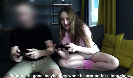 Playing console games with a half-brother is a very exciting activity, which is what the skinny Annie Walker does. Thats just playing for something much more interesting than just like that. As a result, the girl loses and the bro fries her with his hanger, which has long turned into a stand-up in different poses and with different amplitudes and frequencies. And everything would be fine, but the main thing is that the girl does not fly. This is what console games often lead to. Write, have you had something like this?!...