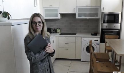 A Russian blonde in a strict business suit came to show the buyer a new home. But the guy turned out to be not timid and just seduced the girl into sex. To begin with, the blonde lecher showed the ability to caress the penis. She opened her mouth and swallowed a member, after which she gladly threw off her clothes. Her tight and wet slit is already open for spanking, and the boy's penis penetrates into the hole with great desire. The woman moans, arches her back and is ready to have an orgasm.