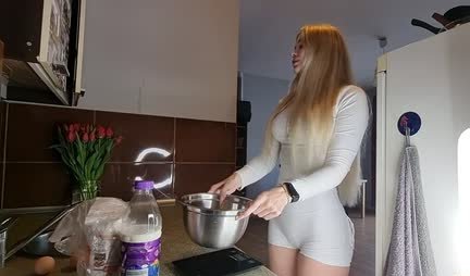 The path to the heart of a man lies through his stomach. That is why a pretty blonde is stirring a stream in which she prepares pancakes, taking off the process on the camera. But the situation here is very dual, because as a result of pancakes, they themselves fried a cutie, which is very pretty and hot. But the main thing here is not food, but sex - although again it happens in different ways ...