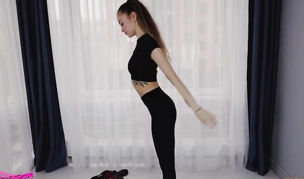A classmate saw a Russian girl in leggings at home in training and was stunned by her elastic ass. Putting the girl on all fours, the boy pulled the leggings down and stroked the head of a hard penis on the buttocks. Very soon, the slender woman will begin to take a juicy phallus inside the pussy and drip lubricant under her.