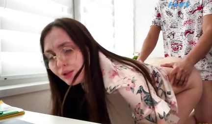 The stepson was going, as usual, not to study, but to masturbate his penis, looking at the naked pictures of pretty girls. He was caught jerking off by his young stepmother. This Russian girl knew a lot about sexual pleasures, so she decided to show her stepson what a real orgasm is. The nurse with glasses took the guy's strong penis into her mouth and began to procrastinate him so that he even began to moan from bliss. After blowjob, stepmom set up pussy for penetration to experience ecstasy together.