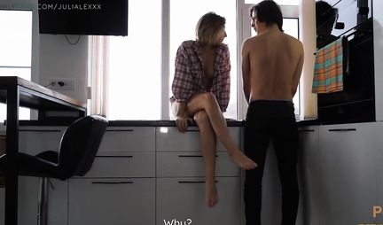 The young couple finally found a suitable apartment and now they live together. Having laid out all her things, the Russian chick, along with her boyfriend, decided to take a little rest. Having seated the cutie with her bare ass on the table, the guy began to gently caress her shaved pussy with his tongue. The girl was so excited from oral sex that she decided to have sex here and now. The couple sat comfortably on the windowsill and they began to fuck there, without even reaching the bedroom, and their moans were heard by all the neighbors.