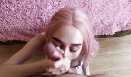 A pretty Russian girl in snow-white lace lingerie and pink hair sits on the edge of the bed and performs a royal blowjob to a dude. His shaved stick is ready to fall into the girl's delicate mouth very intensely and hard, so that she already s on it and receives a sea of warm sperm as a reward.
