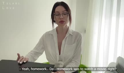 Extra money is not lying on the road, so the teacher of the Moscow University Valeria Ivanovna quite comes to a simple foreign guys home to teach him Russian at 00:19. Doing the homework of a beautiful teacher, student Mark watched a film in Russian, but did not quite understand what it was about, and he tells his teacher about it at 01:12. But she concludes that the guy just wants to fuck her and therefore undresses at 02:03, because he wants the same. Without further ado, the teacher takes off the dudes pants at 02:45 and starts sucking his dick until the lad puts her on the sofa and fucks her twice at 07:05. In conclusion, she licks the guys balls and sucks a cock so that at 13:01 he cums on the face of a pretty teacher.