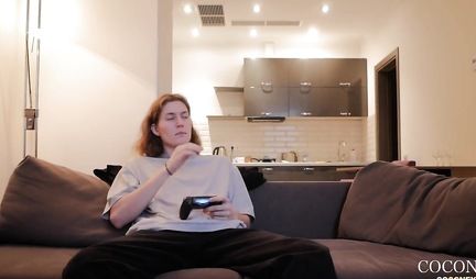 The Russian guy is a real gamer who can spend time on his favorite console all day long. While the guy is playing, his skinny chick is bored. In order to somehow distract the gamer from the console, the brunette climbs into his pants, pulls out a member and begins to give a blowjob. And after the skinny wet pussy sits on the guy's face, he forgets about everything in the world. After a sensual cunnilingus, the Russian girl is transplanted onto her boyfriend's strong trunk in order to reach an orgasm together.