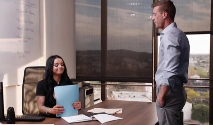 An employee of this office tried very hard to do his job perfectly, but for some reason the boss constantly clung to him. Today she once again slapped him with a reprimand and he understood what was happening. It's just that this dark-haired slut wants to have sex with him. He caressed the big tits of the tattooed boss with such pleasure that he himself was very aroused. Having licked the juicy cap of the beauty in heels, he put a hard cock in her hole and began to fuck so that moans were heard throughout the office.