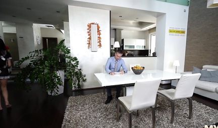 A man hired a pretty brunette not only to keep his house clean, but also for sexual pleasures. The housekeeper always walked around the house in a seductive uniform and wagged her elastic ass. As soon as the man wanted to relax, the sexy housekeeper abandoned all household chores and began to give the man a blowjob. Having licked the clean-shaven cap of a sexy girl, the man rather inserted his bolt into her hole and fucked until he finished.