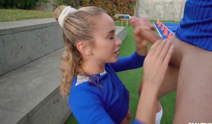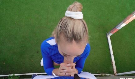 The blonde with her personal trainer arranges a workout every day. But the athletic beauty does not like to drive the ball around the field and do difficult exercises. Instead, the hip-tatted hottie prefers to ride her trainer's hard cock. To begin with, the girl gives the man a blowjob right on the football field, and only then with a wet hole she sits on a strong trunk and groans with delight. This exercise, sitting on an excited member, she likes the most.