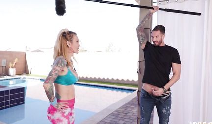 Sarah Jessie wants to be always beautiful and fitness helps a lot in this busty lady, which she does three times a week, and sometimes more often. But today a sound engineer comes to the gym on some business. Seeing a beautiful lady, he cannot take his eyes off her and almost immediately begins to masturbate. Well, in this situation, not to fuck with a fan is a real crime. Well, Sarah Jessie is fucking.