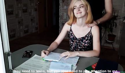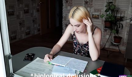 Russian beauty is preparing for the exam in the company of a young and handsome tutor. At some point, she gets tired of endless study and she definitely needs to relax. The guy knows what a young chick needs at such a moment. Substituting his hot penis for caresses, he enjoys a blowjob, and then tilts the beauty with cancer in order to pamper her with hot penetration. The girl is delighted with such a sex lesson with a tutor and ends with groans from real bliss.