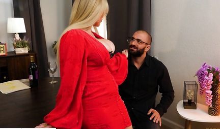 Nurse with big milkings and juicy booty decided to relax and have sex with a beefy bearded guy. He grabbed the milkings, crushed them, then bent the cutie so that her juicy slits opened up for the vaginal. The blonde groaned from the first push into the tight hole, which became wet with desire. The blond beauty squirms, waves her buns and just gets high from the thrusts of the phallus. A bald and bearded guy will bring this lady to orgasm and make her take the sperm.