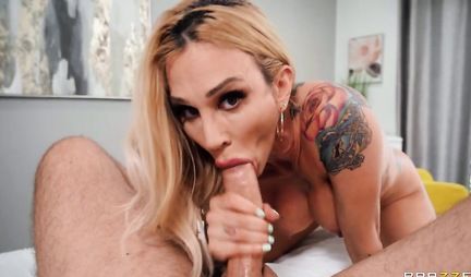 Tattooed blonde with big milkings loves to fuck on the bed very much