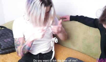 Tattooed Russian chick doesn't mind satisfying her lover's needs, especially when they've had such a good time with each other. The girl with white hair first opened her mouth, gave the guy a blowjob, then knelt in front of him and spread her legs in order to let a strong dick into a clean-shaven crotch. The cutie groans, waves her buns and just gets high from the pushes of the wand into her hole for the most poured eggs. Russian lovers will never forget this sex.