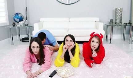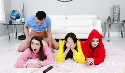 Three young and gentle beauties during a pajama party decided to play a little naughty and seduced one guy into group sex. They in turn began to substitute holes for love. The hard penis of the libertine gets inside and fucks the pretty girls until they have had fun.