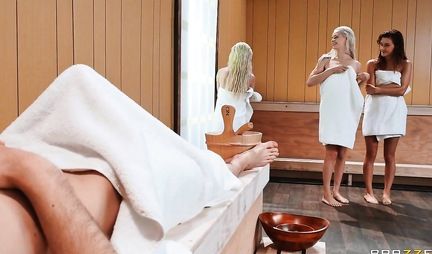 Three chicks in the sauna are set up only to please the attention of a special guy. After all, he has a big dick, and how can you resist. Here are the lovely ladies and opened their mouths in order to give him a blowjob. It was nice enough, especially when the chicks after that already presented him with tight holes that were ripe for group vaginal fucking. The only thing left for the guy is to enter every hole, satisfy the needs of the lady and make them cum right on this shelf.