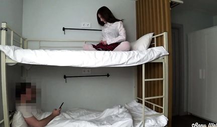 A student in a short skirt came to a foreign city on a tour and was now to spend the night in a hostel. Of course, this is not a cozy home environment, but still, it was comfortable here. In the same room with her, a handsome guy spent the night, whom the young girl decided to seduce before going to bed. A student in golf climbed out of her bed specifically to pamper a new friend with a hot blowjob. After sucking, they had hot sex and the girl finished with pleasure.
