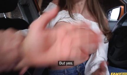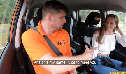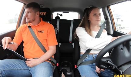 In the car, the girl sits with a wet hole on the dick of the driving instructor