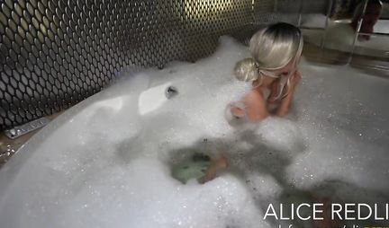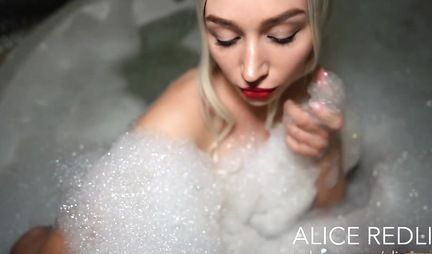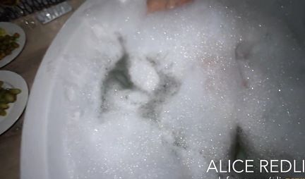 In the bathroom, a glamorous beauty drank wine and made a gentle throat blowjob
