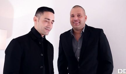A business lady in a dress and heels did not refuse her colleagues a pleasant pastime after the deal. She is already on her knees in front of them, opened her mouth for a blowjob group, and then spreads her legs. It's not a problem for this brunette to cum from double penetration and bring men to ecstasy.