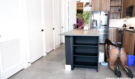 A young couple hired a housekeeper because they don't have enough time to clean up. This couple is constantly fucking, as soon as they have free time. While the long-haired Latina cleaned their kitchen of dirt, they began to caress each other, not at all embarrassed by the presence of the housekeeper. Moreover, they accepted a beauty with a magnificent ass into their company in order to have group sex and have fun together.